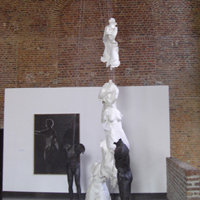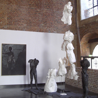 Après deux installations dans l’univers du travail ouvrier, La Tossée, la PPGM, l’association Art en Cambraisis, présidée par Jean Paul Lemaire, m’a invité pour une installation dans le hall du Théâtre de Cambrai. Ce lieu d’accueil est en fait une magnifique chapelle baroque. La chapelle St Julien offre un espace qui, par ses proportions et sa hauteur, m’a permis d’amplifier la dimension symbolique de mon travail. |